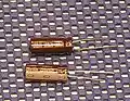 Axial 1000 µF capacitor with a maximum voltage rating of 35 V (black), and radial 10 µF capacitor with a maximum voltage rating of 160 V (blue).
