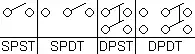 - DPDT = double pole double throw, equivalent to two SPDT switches controlled by a single mechanism.