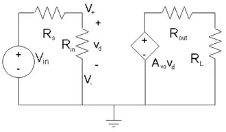 The model for the op-amp is shown in Figure 1. Where V+ − V− is equal to vd; Rin is the input impedance; Rout is the output impedance; Avo is the open loop gain; and Rs is the source impedance.