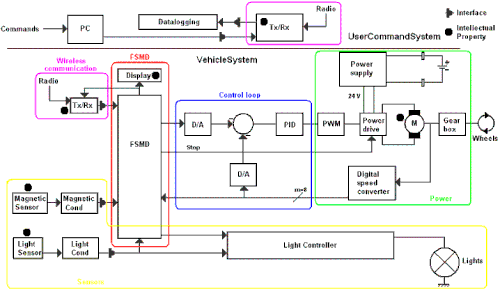 Now the top of People Move Company decides who will work on which part of the job. In some cases it is useful to work with subcontractors. The company can also hire an expert with relevant experience. By dividing the system in subsystems, different teams can work concurrently to realize these different subsystems. This is called concurrent engineering. Good inter-team communication, e.g. in daily or weekly meetings, makes it possible to attune to each other. The optimal division in subsystems minimizes subsystem-communication and maximizes subsystem-independency. Afterwards the subsystems are assembled into a fully operational system. Applying the division strategy on the automated peoplemover results in seven subsystems. Figure 3 illustrates the subsystems for the vehicle system of the automated peoplemover. The last two subsystems are omitted in this illustration as they are not really related with the embedded aspect of the design. Therefore they will not be treated in the rest of this example.