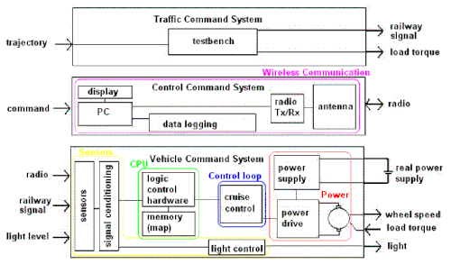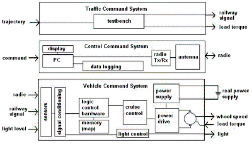 Each part has a couple of inputs and outputs, represented by arrows in figure 1. The traffic command system for example gets information from beacons placed along the railroad and from the slopes themselves. These beacons indicate a change in speed of the peoplemover. A map of the railroad together with the meaning of each beacon has to be loaded into the memory of the peoplemover before the vehicle can drive on the railroad. A sensor on the vehicle detects the beacons and reacts as indicated on the map. The slopes result in a certain load torque. The inputs and outputs of the other parts are indicated on figure 1. Figure 2 describes the content of each part in more detail.