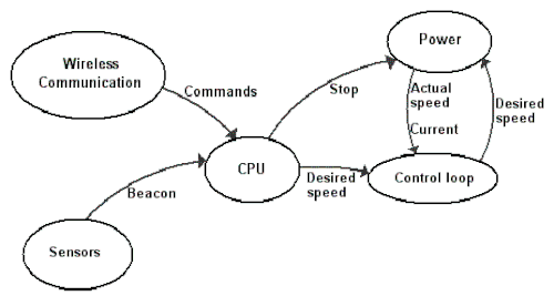 Of course these subsystems cannot work on their own islands. Interaction between the different subsystems is inevitable. People Move Company designates an 'integrator' who will coordinate the discussions on how transfer of information between subteams will be implemented. Figure 4 shows which subsystems need to communicate with each other. The mechanical and aesthetic design teams are not drawn as they have to be in contact with all other teams. For example, "CPU" needs to know when the control room wants to take over control. This information can be wirelessly transferred to the peoplemover. "Sensors" can provide information from beacons that indicate a desired velocity. This is a necessary input for the "Control loop" subsystem.