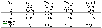 Each set of rates is put into the model, so there will be 1,000 sets of results. These can be sorted to find (say) the 10% and 90% percentiles, which gives the actuary a feel for how well – or badly – things could go in future.