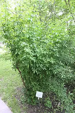 ![]() devil’s walking stick, Hercules’s club One distinguishing characteristic of this section is that all members bear prickles on their stems, while the species of all other Aralia sections remain unarmed.[1] The native Aralia spinosa (devil's walkingstick) is similar in appearance to the exotic invasive Aralia elata (Japanese Angelica tree). Reports of Aralia spinosa in the New York City area are probably Aralia elata.[2]
