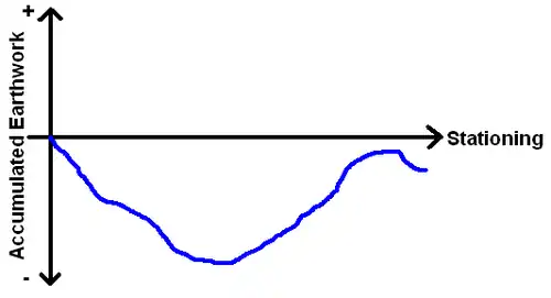 Similar to the cut and fill diagram, the mass balance diagram is illustrated on two axes. The X-axis represents site location along the roadway corridor and the Y-axis represents the amount of earth, either in excess (positive) or needed (negative).