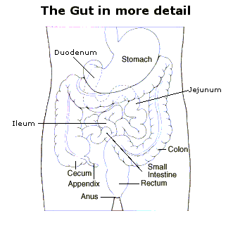 It is useful to know that the small intestine consists of the duodenum, jejunum and ileum and the large intestine consists of the caecum, colon and rectum in that order. The appendix is a small cul-de-sac at the base of the caecum. Only the terms in italics are needed by most GCSE boards.