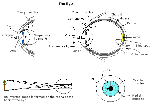 Light from the surroundings enters the eye through the pupil. It is focussed by the cornea and lens so that it forms an image on the retina. The cornea performs crude focussing and the lens performs active, fine focussing. The eye is filled with transparent liquid (the humours).