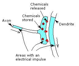 Neurones connect to other neurones by means of synapses. Nerve impulses travel down the axon to one side of the synapse where the electrical signal causes chemicals to be released. These chemicals diffuse across the gap and generate an electrical impulse in the neurone on the other side of the synapse.