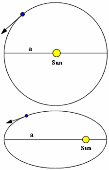 | Two elliptical orbits with the same major axis but different eccentricity. |
