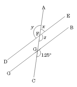 Let us look at an example. Given that DE and GB are parallel, how can we find x, y and z?