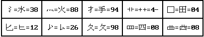 This means that all elements in array input can be expressed as a two digit number or a one digit number and a - sign. Many of the elements share the same number, for example the elements 立 and 亠 are both written as 61 (、(6) and 一 (1) ) but the system is more precise than simply writing the letters of the keys. Also it fits the whole concept of thinking in terms of rows and columns that forms the basis for Array input.