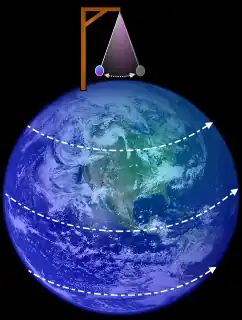 In 1851, a French scientist named Léon Foucault took an iron sphere and swung it from a wire. He pulled the sphere to one side and then released it, letting it swing back and forth in a straight line. A ball swinging back and forth on a string is called a pendulum. A pendulum set in motion, will not change its motion, so it will not change the direction of the swinging. However, Foucault observed that his pendulum did seem to change direction. He knew that the pendulum itself could not change its motion, so he concluded that the Earth, underneath the pendulum was moving. Figure 24.9 shows how this might look.