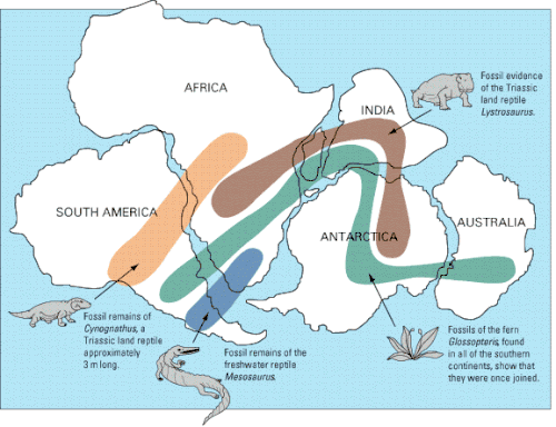 • Similar remarks might be made about the ranges of certain flora and fauna as indicated by their distribution in the fossil record. For some examples, see the map to the right, which shows the distribution of various fossil species across the southern continents, which are represented in the relative positions inferred by the "drifters". Such a distribution would be very difficult to explain if the continents had been at their present positions when these species lived. "Fixists" used to postulate "land bridges" rising and falling between continents to explain these biogeographical features, but this was very much an ad hoc explanation, for which they could provide no mechanism; and it would not explain other features that are explained by drift.