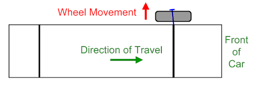 Once the car tracks straight, observe the "IN-OUT" behavior of the wheels. Here, IN is toward the body and OUT is away from the body. Perform two trials with the car facing forward. First, move the wheel in to touch the body and roll (or let the car roll) down the slope. Next, move the wheel to the end of the axle and repeat the forward trial. If the wheel moves from the inside to the outside, and stays at the outside when starting there, the result of this trial is OUT. Likewise, if the wheel moves from the outside to the inside, and stays at the inside when starting there, the result of the trial is IN. If the wheel stays put each time, the axle is aligned or nearly aligned.