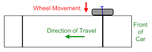 Toe/Steer: If the wheel moves to the body when the car is moved forward and to the axle head when the car is moved backward, then that wheel is toed in; the axle head is angled forward and should be adjusted rearward by shimming on the front side of the axle. If the wheel moves to the axle head when the car is moved forward and to the body when the car is moved backward, then that wheel is toed out; the axle head is angled backward and should be adjusted forward by shimming on the rear side of the axle.