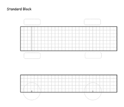 The first step in designing your car is picking the wheelbase. If the rules of your race do not specify that the original wheelbase or axle slots must be used, it is often possible to improve car performance using the longest wheelbase. WIth a long wheelbase, the weight can be moved further to the back while still remaining forward of the rear axle and errors in wheel alignment will affect the long wheelbase car less since it has a larger turning radius for a given angular wheel deflection. The standard pinewood derby wheelbase is about 4.5 inches. The extended wheelbase is 5.75 inches with the wheels 5/8 inch from the end of the 7 inch block.[2] Even when the standard wheelbase is required by the rules, it may be possible to move the rear axle back by cutting off the back of the block, leaving 5/8 inch between the axle slot and the back of the block, and gluing the removed piece to the front of the car.