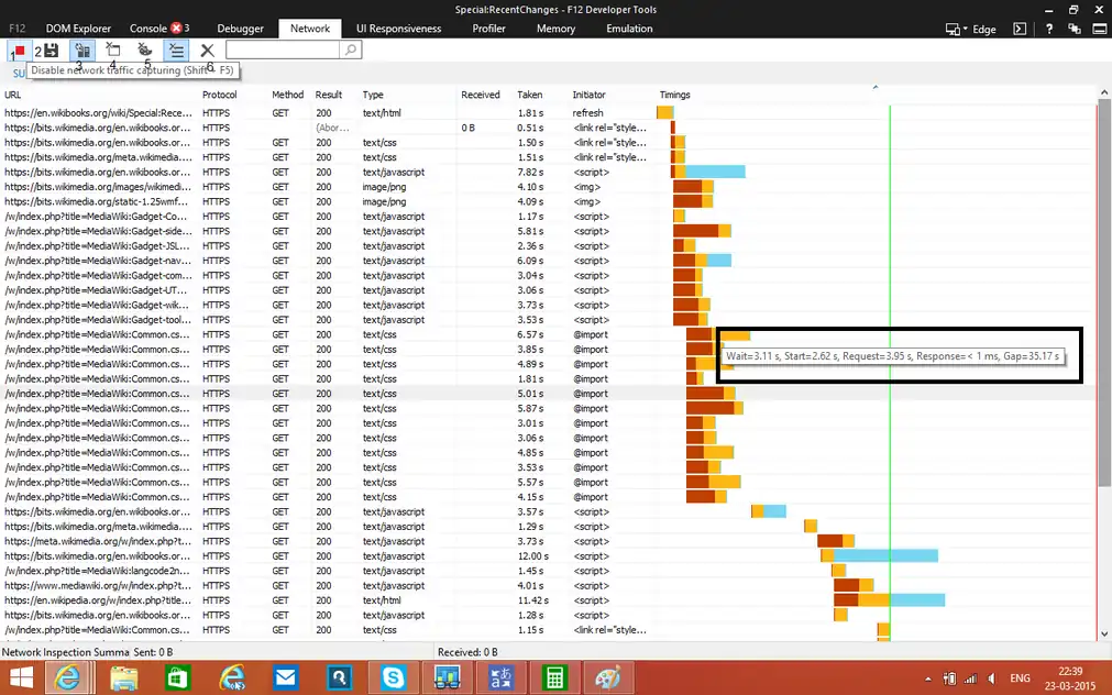 Another important feature, when enabled, this shows the delay, responding time and loading time of each and every element in the webpage. It could be JavaScript files, images, just about anything. Clicking on the element details shows more details about it.