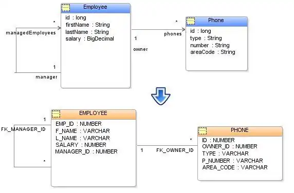 JPA also defines a ManyToMany relationship, which is similar to a OneToMany relationship except that the inverse relationship (if it were defined) is a ManyToMany relationship. The main difference between a OneToMany and a ManyToMany relationship in JPA is that a ManyToMany always makes use of an intermediate relational join table to store the relationship, whereas a OneToMany can either use a join table, or a foreign key in target object's table referencing the source object table's primary key. If the OneToMany uses a foreign key in the target object's table JPA requires that the relationship be bi-directional (inverse ManyToOne relationship must be defined in the target object), and the source object must use the mappedBy attribute to define the mapping.
