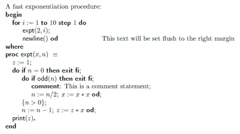 LaTeX has several packages for typesetting algorithms in form of "pseudocode". They provide stylistic enhancements over a uniform style (i.e., all in typewriter font) so that constructs such as loops or conditionals are visually separated from other text. The pseudocode is usually put in an algorithm environment.