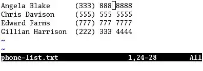 block-visual is started by pressing <Ctrl-V> (or <Ctrl-Q> in some windows versions. If neither of these works use ":help visual-block" to find out how). Visual blocks always maintain a rectangular selection, highlighting only specific columns of characters over multiple lines. In this following example the user wants to put a dash in each phone number between the second and third number fields: