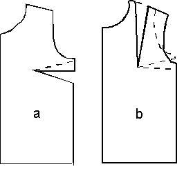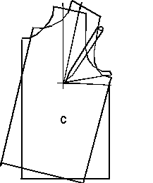 You do this in the following way: Draw an extra basic pattern. Draw it on transparent paper and cut it out. Make a mark where you want the new tuck, both on the pattern and on the transparent paper. Place the transparent paper on the pattern and the point of the pencil on the breast point, as shown on figure 2c. Fold the transparent paper as far down as the side tuck, make a mark on the shoulder where the mark on the transparent paper is now. Draw round the edge of the transparent paper from the mark and down to the original tuck. Then draw lines from the two marks on the shoulder and down to the breast point, so you make a new tuck.