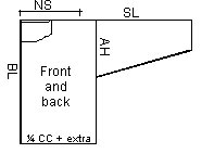 Figure 2: You start with marking out the back length along a vertical line; this is the middle of the backside. Then you mark out 1/4 of the chest circumference perpendicular to the back line at its bottom end, and continue until you have a rectangle. You may round the neck a little, or draw it straight. Draw the neck opening as a square measuring 1/2 NS both horizontally and vertically; that leaves space for a neckband. Elongate from the shoulder outwards with the sleeve length, which starts at the NS mark.