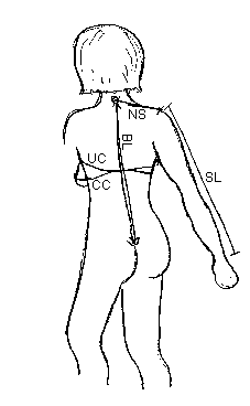 First, you mark out BL along a vertical line; and perpendicular to that, at its bottom end, you mark out 1/4 UC for the back, and 1/4 UC plus half the difference between CC and UC for the front. Having come so far, you turn again upwards at right angles. On top, the shoulder line is drawn perpendicular to the back line. Along it, you mark out NS, and from there, you turn down at right angles and mark out AH, which may be equal to NS or slightly more, if you want. At the last part of it, you round out outwards to meet the sideline. You find the neck by halving NS and use the same measurement vertically and horizontally. You may slant the shoulder line as shown in the drawing, but it is a matter of maximally 2 cm.