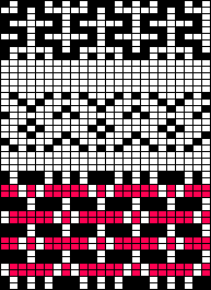 Figure 3 shows on top the pattern, below that how to make your card if you can knit a negative and twice as high, and at the bottom how to make the pattern if you cannot. The black ones are pattern rows, the red ones are base colour rows, the white ones are the needles that remain in knitting position, and thus are out of function.