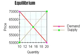Since the demand curve slopes down and the supply curve slopes up, if they are put on the same graph, they eventually cross one another. Graphically, this consists of superimposing the two graphs that we have; at the point where the two lines, the supply line and the demand line, meet, is called the equilibrium point for the good. To return to our example of houses; in the end, if the equilibrium point for the house price is $60,000, everyone who wants to buy on that price will find a house, and everyone who wants to sell on that price will find a buyer.