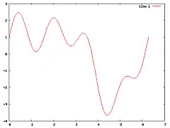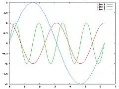 Line 11 creates a new graph window and line 12 tells Octave that any subsequent plots should simply replace previous ones. Line 13 generates the plot of the sum of the 3 trigonometric functions. A small note for mac users, if plot figure commands do not work first use this command: > setenv ("GNUTERM", "x11")
