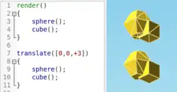 OpenSCAD is a 2D/3D and solid modeling program that is based on a Functional programming language used to create models that are previewed on the screen, and rendered into 3D mesh that can be exported in a variety of 2D/3D file formats.