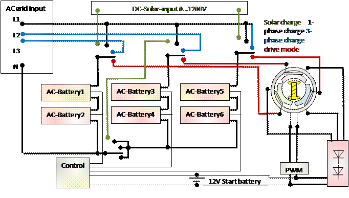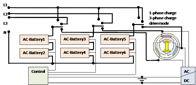 3-phase ESM motor drive and 1-phase / 3-phase AC direct grid charge with 6 AC-batteries in star connection. 0–1200 V DC solar charge with 6 AC-batteries in series connection. No charger, no inverter, no AC/DC converter. 6B-rectifier on star point is used to recharge 12 V.