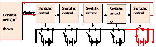 Another "down" signal switches off the third cell (condition: marker-in off AND cell was on). Stepping up and down will rotate the used cells in a "caterpillar style", so that statistically all cells see the same load. Several "down" commands will succesively switch all the cells.
