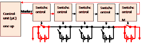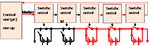 In idle state, all switches of all battery packs are tristate and thus safe. For starting operation, the control head shall put out a "marker" signal and 100ms an "idle" signal to wake up the battery pack. The switching cell next to the control head will store this "marker" information.