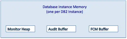 The memory allocated for each DBMS instance is Database Instance Memory, it is allocated one per DB2 instance, and is used It is used for instance level tasks such as monitoring, auditing and inter-node communication. It is allocated when the DBMS is started (db2start), and freed when it is stopped (db2stop).