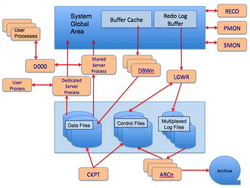 The LRU list holds empty buffers (free buffers), buffers in use (so called ‘pinned buffers’ because they are pinned in memory to prevent them being evicted during use), and dirty (modified) buffers waiting to be moved to the write list. When a process accesses a buffer, the buffer is moved to the end of the LRU list called, appropriately enough, the Most Recently Used end. This process of migrating buffers through the LRU list as they are accessed means that those that are infrequently accessed move to the least recently used end and become candidates for eviction from the cache by the LRU algorithm. Since it is desirable to keep the most frequently accessed data available in shared memory (i.e. data, indexes, SQL statements and query plans), there is a situation that can arise when there are sets of data that are being continually accessed that will be pinned in memory and not written to disk. To make sure that this data is written to disk (for permanence) and saved in the undo logs, there is a checkpoint process (CKPT) that runs periodically to do just that by signaling the database writer process(es) DBW0, DBW1, etc... (for efficiency, there can be more than one database writer as we will see later).