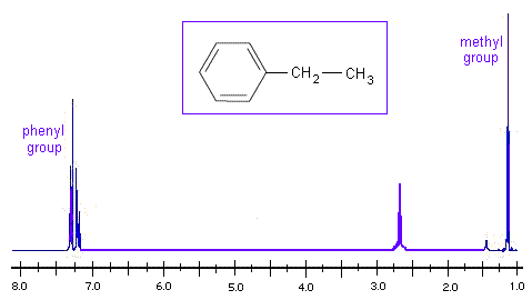 Looking at the H NMR spectrum of ethyl benzene, we see that the methyl group is the most electron withdrawing, so it appears at the lowest chemical shift. The aromatic phenyl group is the most electron donating, so it has the highest chemical shift.