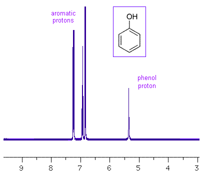 These two states have different potential energies and the energy difference depends on the strength of the magnetic field. The strength of the magnetic field about a nucleus, however, depends on the chemical environment around the nucleus. For example, the negatively charged electrons around and near the nucleus can shield the nucleus from the magnetic field, lowering the strength of the effective magnetic field felt by the nucleus. This, in turn, will lower the energy needed to transition between the +1/2 and -1/2 states. Therefore, the transition energy will be lower for nuclei attached to electron donating groups (such as alkyl groups) and higher for nuclei attached to electron withdrawing groups (such as a hydroxyl group).