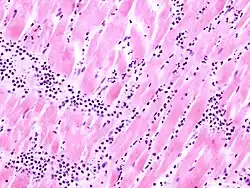 Pathogenese: Herzmuskelnekrose durch Virus und T-Zell-vermittelte Immunreaktion.