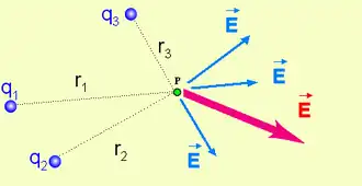 In physics, the electric field superposition principle postulates that, for all linear systems, the net response at a given place and time caused by two or more charges is the sum of the responses which would have been caused by each charge individually.