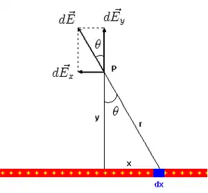 In these expressions > must integrate to zero because every element of charge to the left of the perpendicular point P has a corresponding element on the right so that their contributions to the field in the horizontal direction cancel each other. So points in the vertical direction only. As for the electric field contributions to , the right half and left half of the charged lines will make an equal contribution, so we can write: