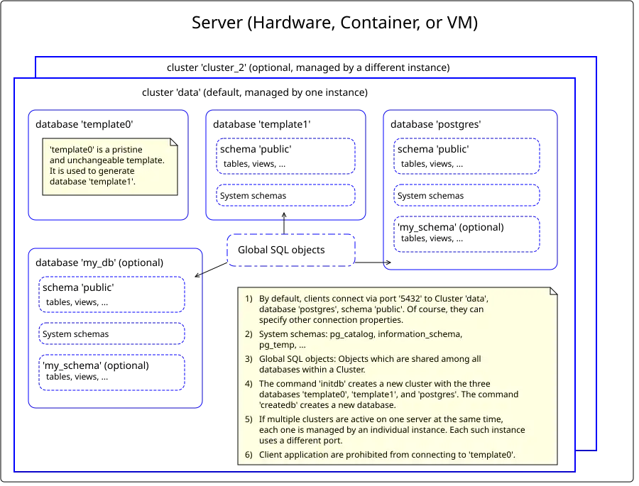 A Server, which is some hardware, a container, or a VM, contains one or more Database Clusters (Cluster for short). Every cluster is controlled by exactly one instance. If there are many clusters and instances on the same server, the ports of the instances must differ from each other as well as the root directories of the clusters.