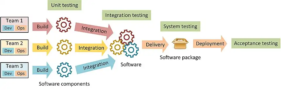 In DevOps, software components built by distinct DevOps teams are tested in isolation (unit testing). They are then assembled to create a single software (integration). Afterwards, the software is tested (integration testing) and put into a form—often called a package—that facilitates its distribution (delivery). Next, the package is tested (system testing) and installed into the production environment (deployment) to be tested one last time (acceptance testing). DevOps prescribes that operators should assist developers in order to automate entirely these stages. When done, continuous integration, continuous delivery, continuous deployment, and continuous testing are respectively achieved.