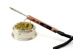 The tip of the soldering iron is, by design, very hot, exceeding 370°C (700°F). Avoid letting the tip touch skin, clothing, or anything that might melt, scorch, or burn. Use a proper soldering iron holder when the iron is powered on. These offer a convenient place to rest the iron and keep anything from touching the hot tip. The small plastic-and-wire stands that come with inexpensive soldering irons can be dangerous, as they leave the tip exposed and the iron can easily roll off the stand.