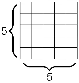 Area of five rows by five columns = 5 × 5 = 52 = 25.