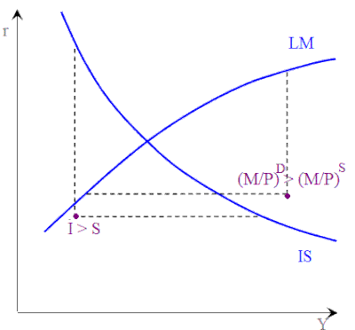 If one ever goes below the IS curve, there is a particularly low interest rate considering the amount of money in circulation in the economy (reflected by Y), and firms do more investing (I) than there are savings to do this with (savings S). This forces the point upward, and we return to the IS curve. There is another solution: that low interest rate can be reached if the economy expands, resulting in more savings (which would drive down the interest rate).