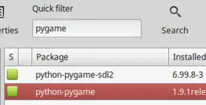 Search for "pygame", and you should download the python-pygame package. It should also install the Python dependencies at the same time.