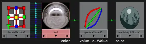 - Drag the gamma node to a convenient location, so that you can still see the "file1" node, and the "mentalrayIblShape1" node; preferably between these two. You can zoom / pan in the views with the standard camera controls.