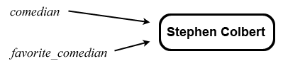 Now, we have two variables that we can use to refer to the same String object — comedian and favorite_comedian. Since they both refer to the same object, if the object changes (as we'll see below), the change will show up when using either variable.