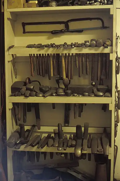 Simple self-made woodworking projects include saw benches and saw horses, a stationary workbench, bench hook, miter box, and wooden mallets. A blacksmith can make many of their own tools, including a forge, chisels, hammers, punches, drifts, and fullers. A skilled one can make tongs, specialized hammers, hardies, flatters, and swages. Combining wood and iron work can produce cutting tools like axes and chisels, planes, drawknives, spokeshaves, claw hammers, and screwdrivers. David Gingery even wrote a book series on how to build metalworking machines from scrap. At a more advanced level, a well-equipped machine shop can make many of the parts for another machine shop.